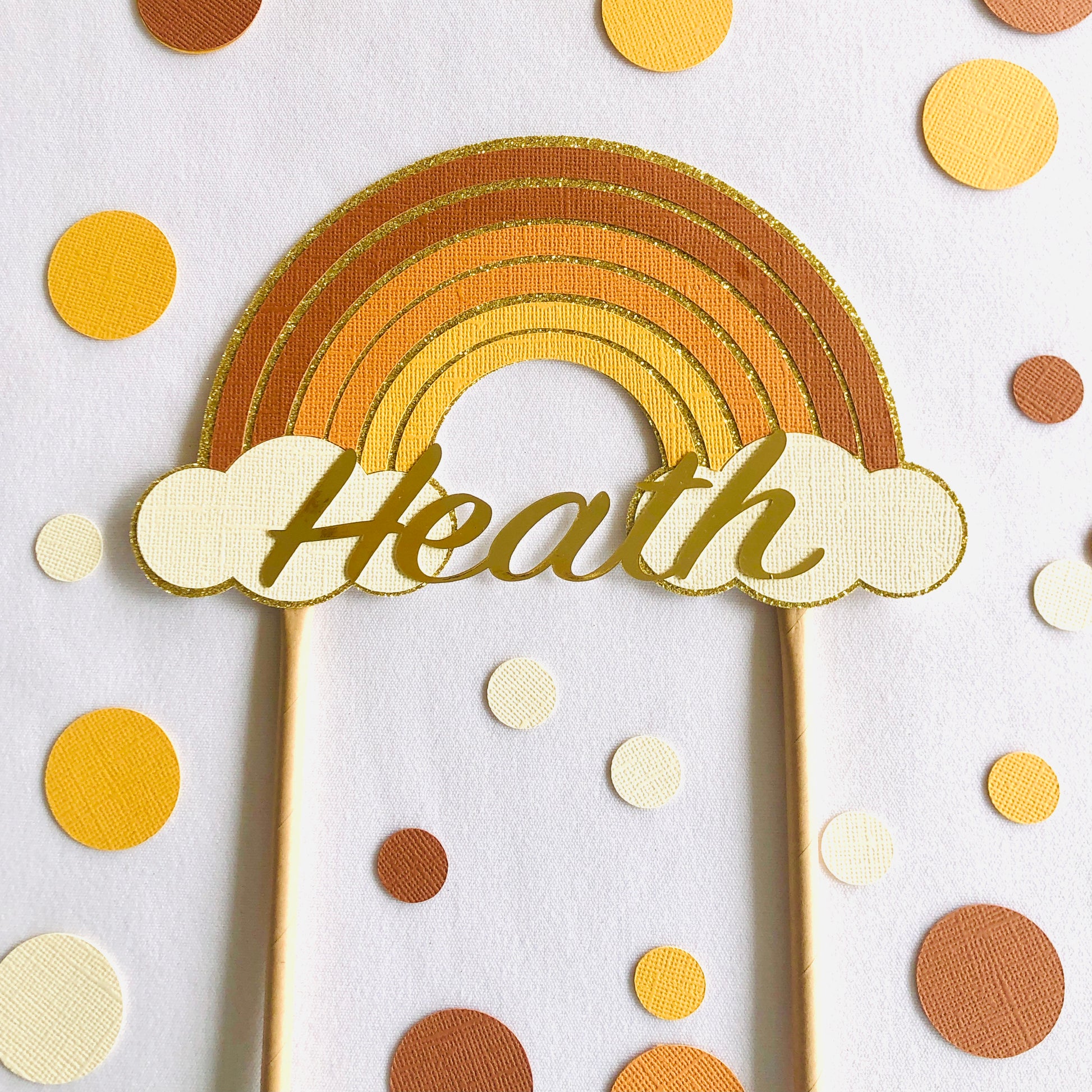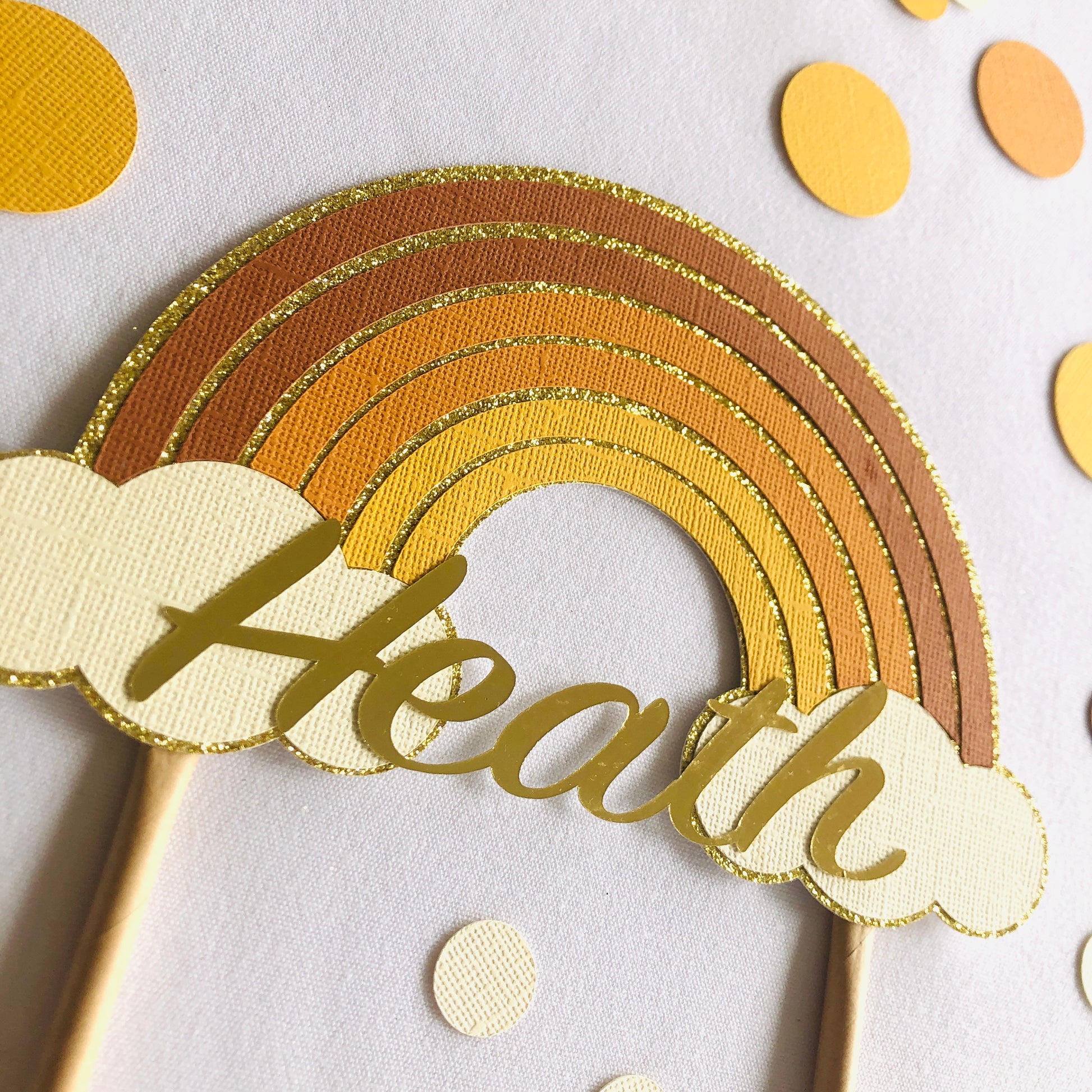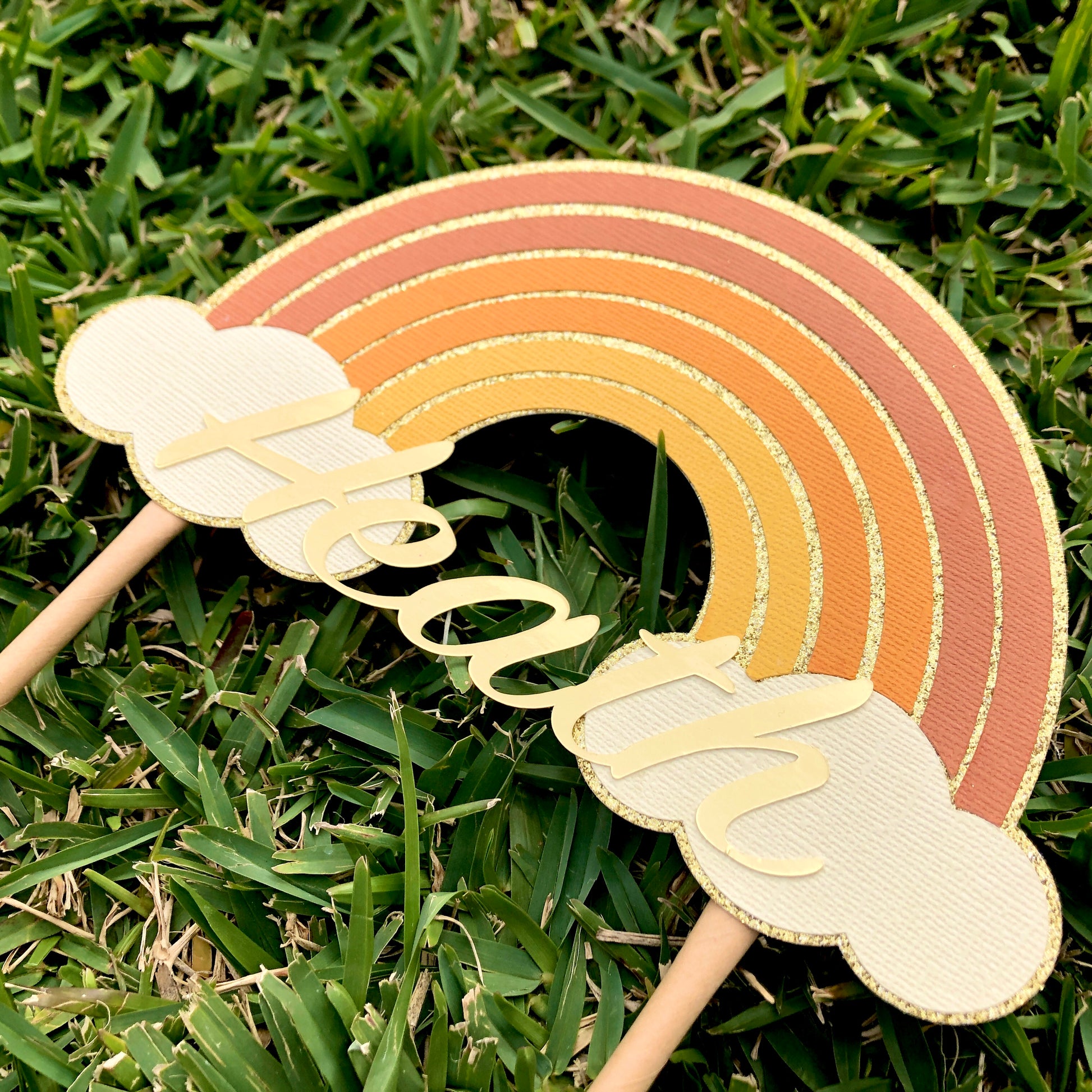 It is made from high quality metallic gold glitter and gold mirrored card for the name✨ the Boho Rainbow Cake Topper is Mustard Yellow, Burnt Orange and Brown the clouds are cream finished off with brown sugar cane straws this is sure to impress and make the cake or flowers stand out.
