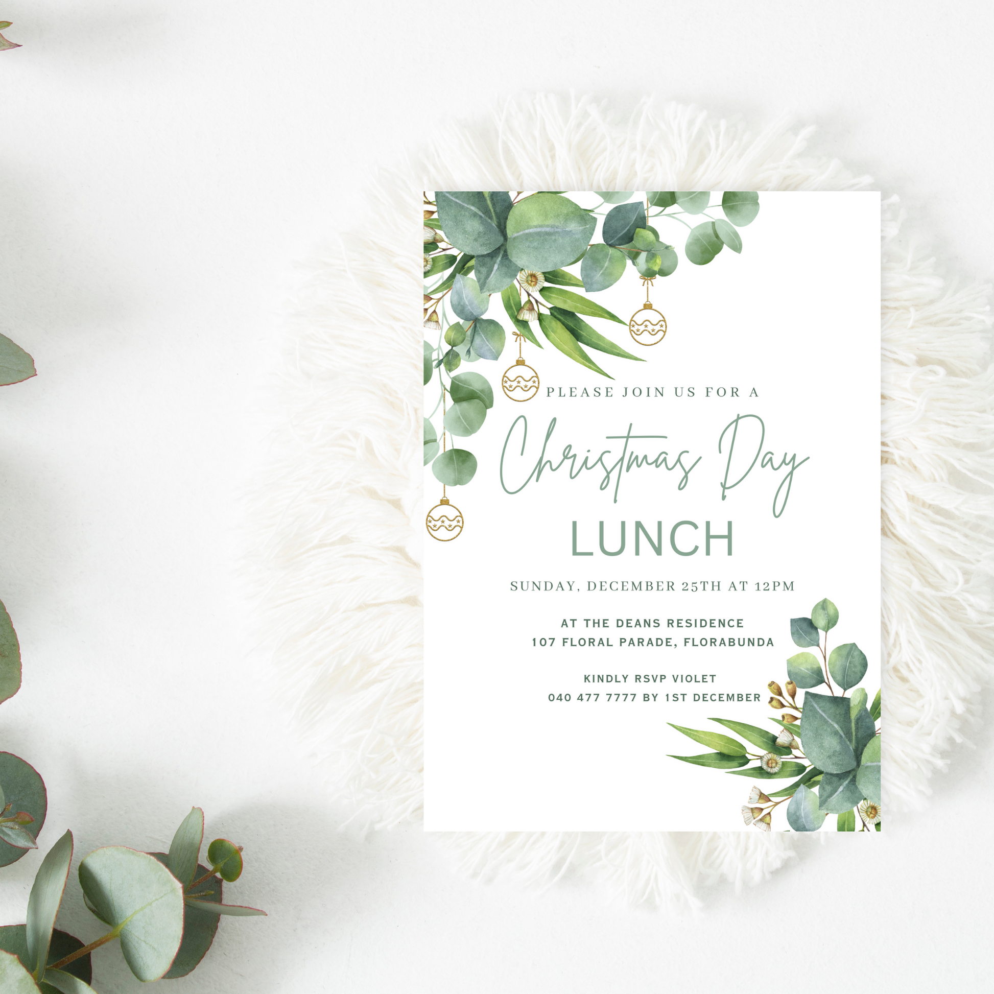 Celebrate the holiday season in style with our stunning Christmas Party digital invitation! This beautifully designed invite combines the natural charm of lush eucalyptus leaves with the festive sparkle of gold baubles, creating a perfect blend of elegance and cheer. Ideal for both formal gatherings and cozy holiday get-togethers, this invitation adds a touch of sophistication to your event.