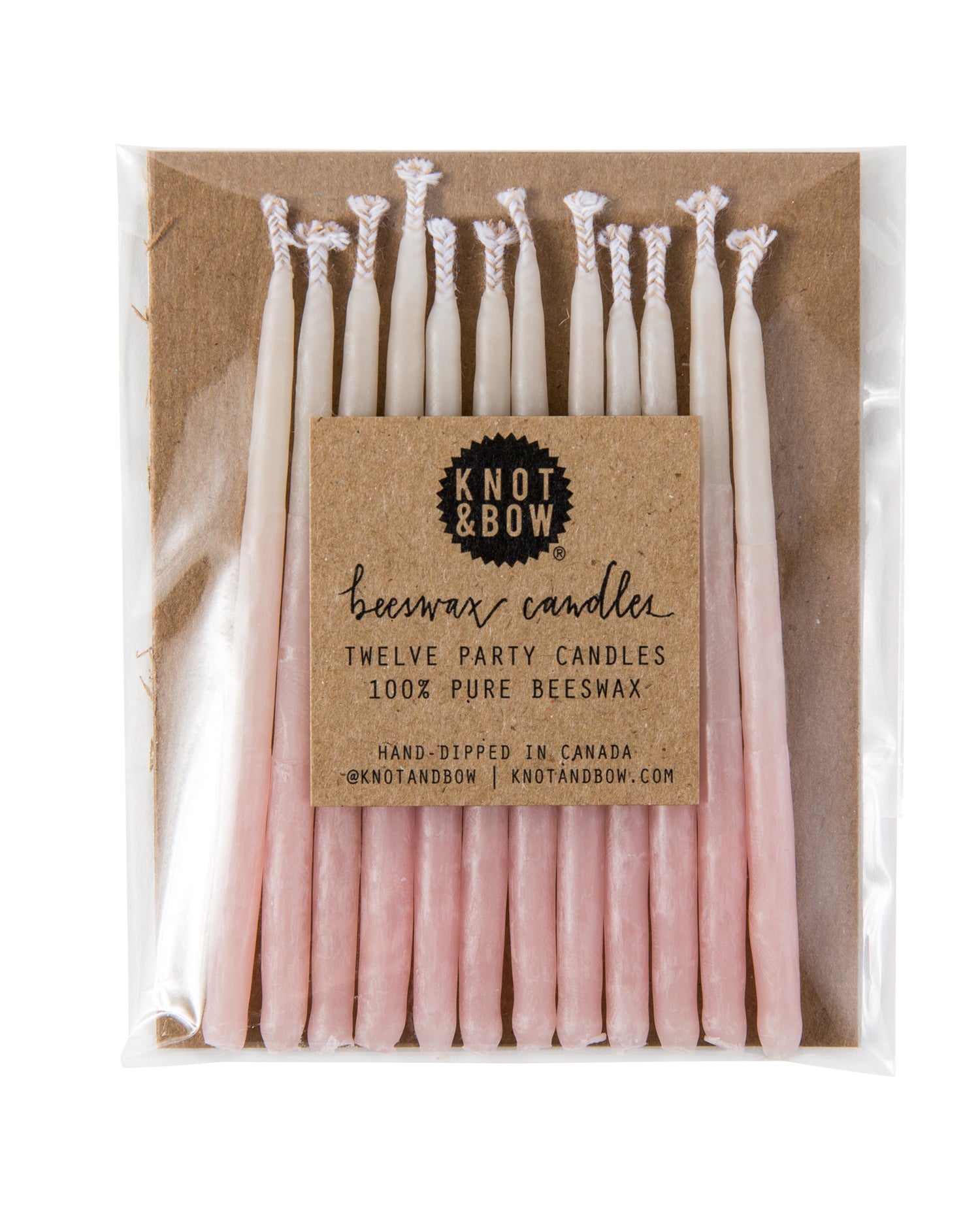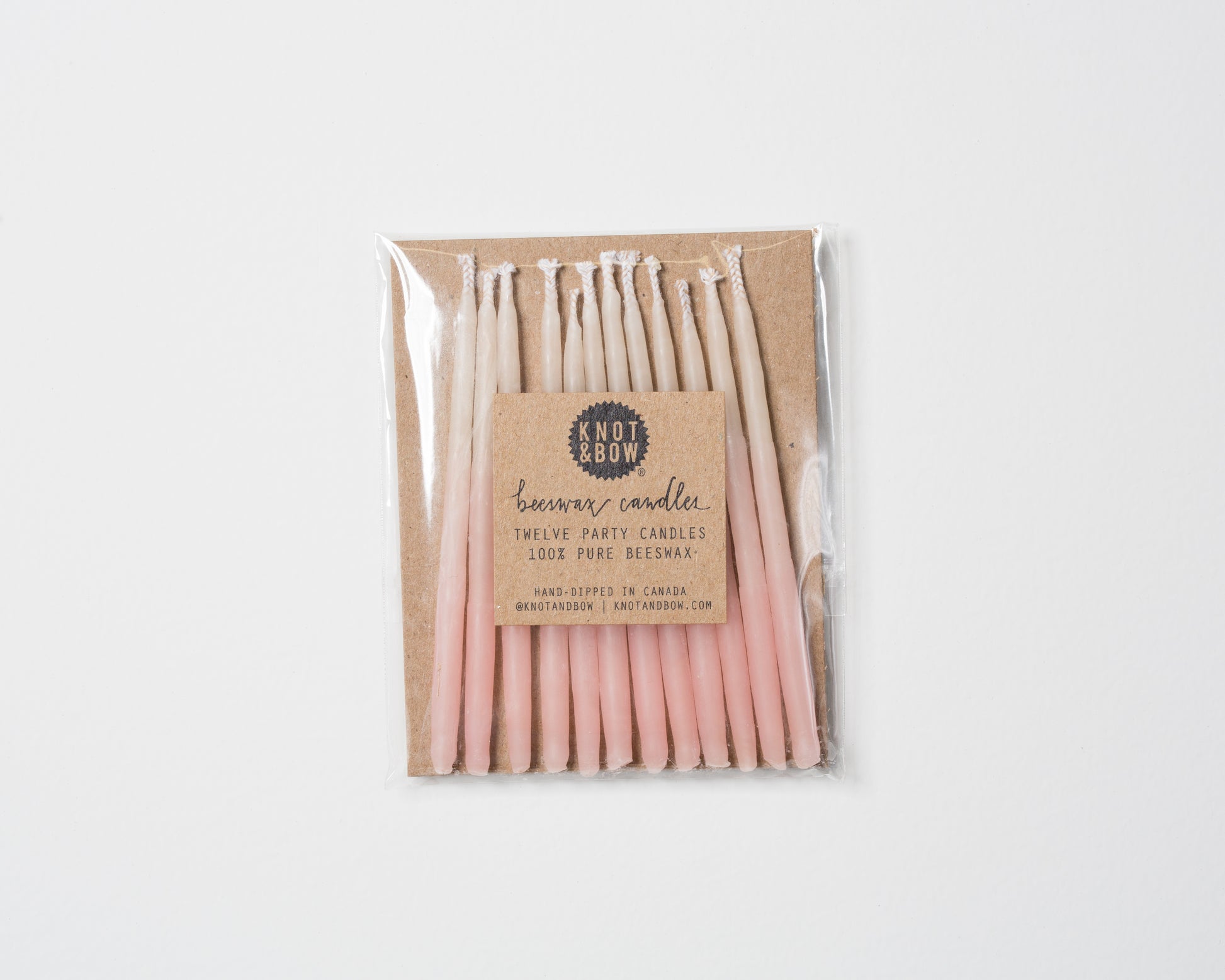 The pack contains 12 pure pastel pink beeswax candles, 3" or 8cm tall, Burn time of 10-15 minutes, Hand-dipped in Canada for Knot and Bow and assembled with love in Brooklyn.