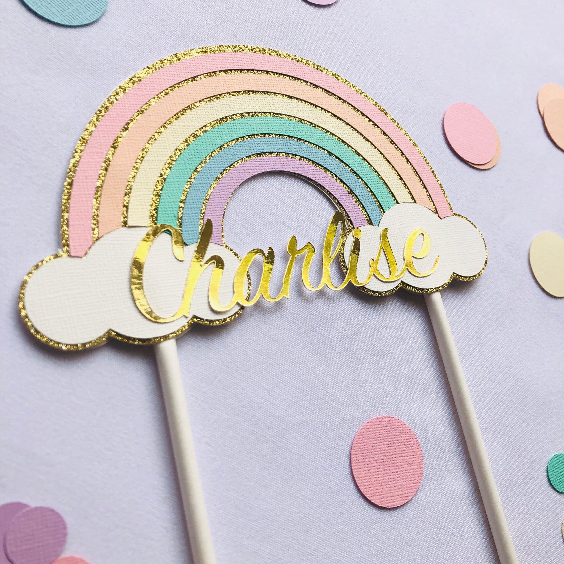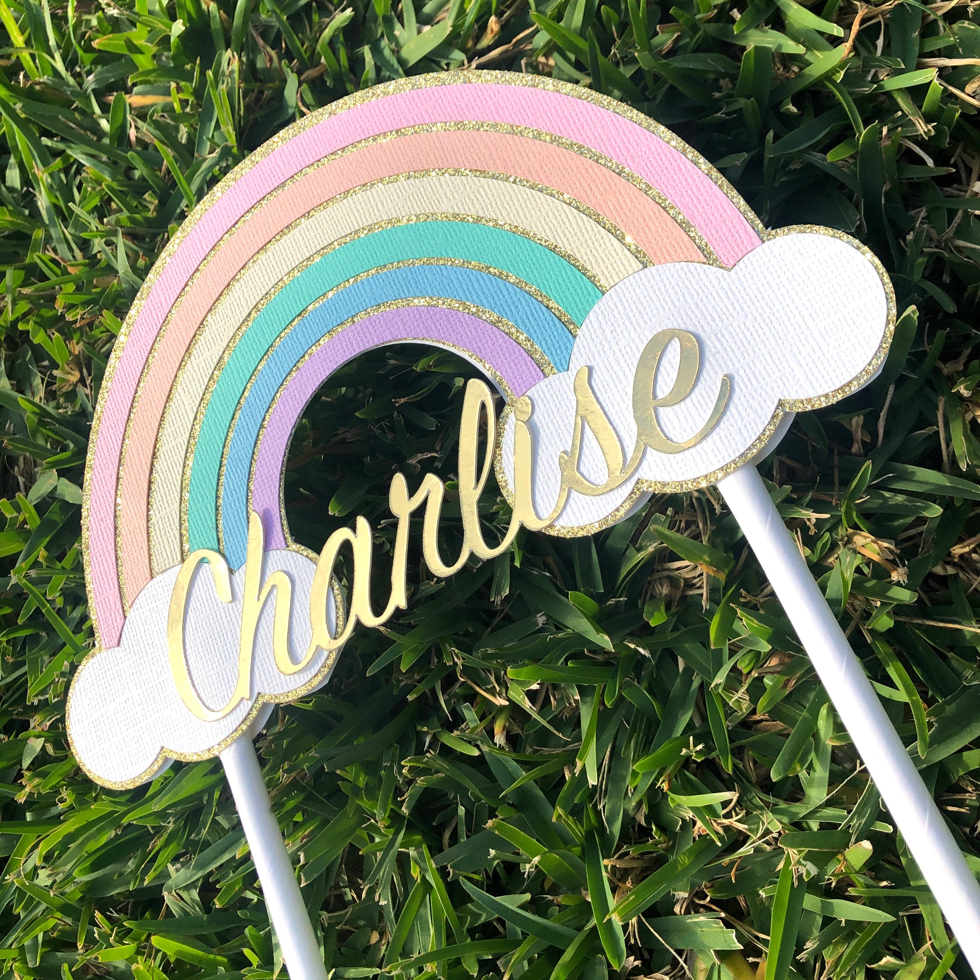This pastel rainbow cake topper is made from high quality metallic gold glitter and gold mirrored card for the name ✨ the rainbow is pastel pink, orange, yellow, green, blue and purple and the clouds are white finished off with white straws this is sure to impress and make the cake or flowers stand out.