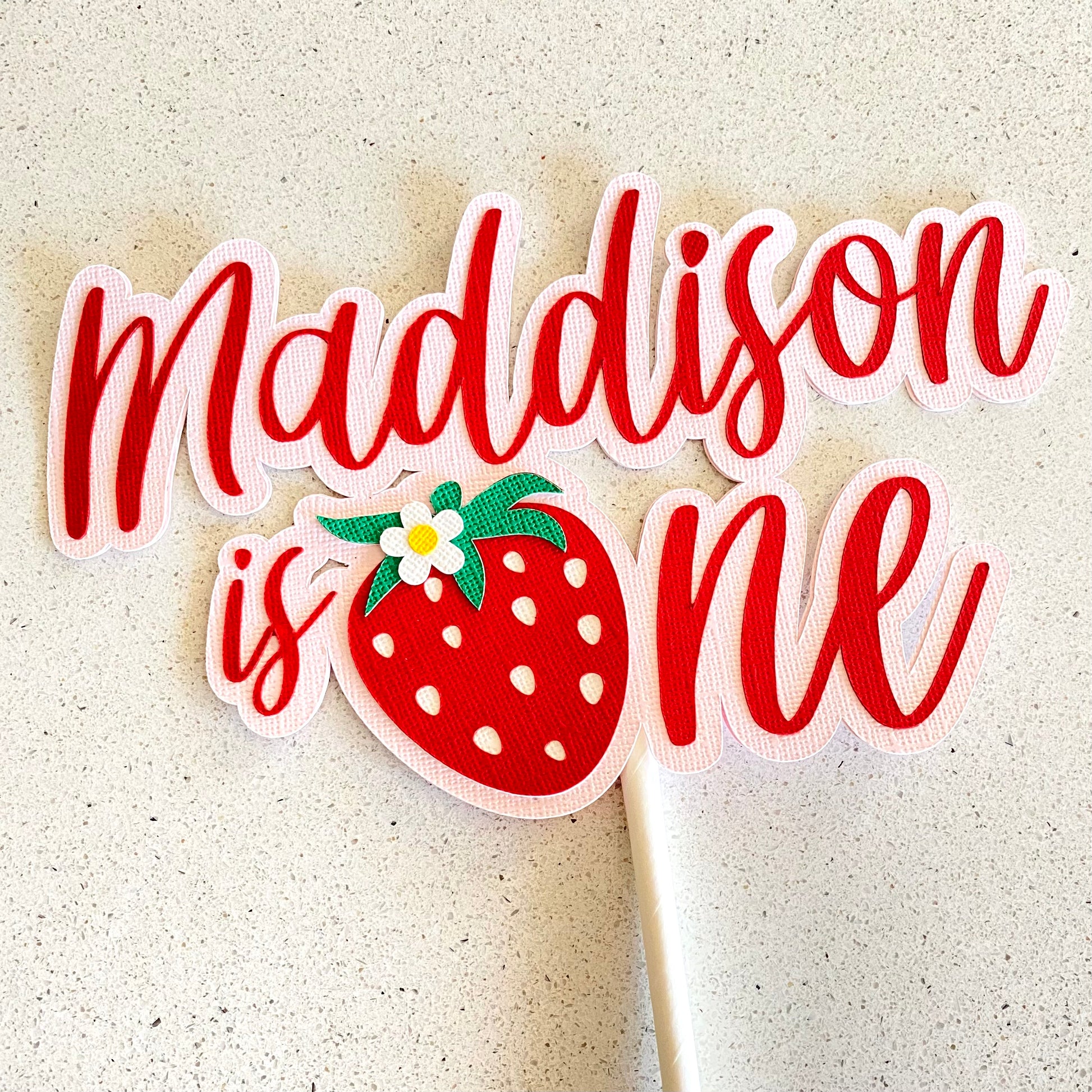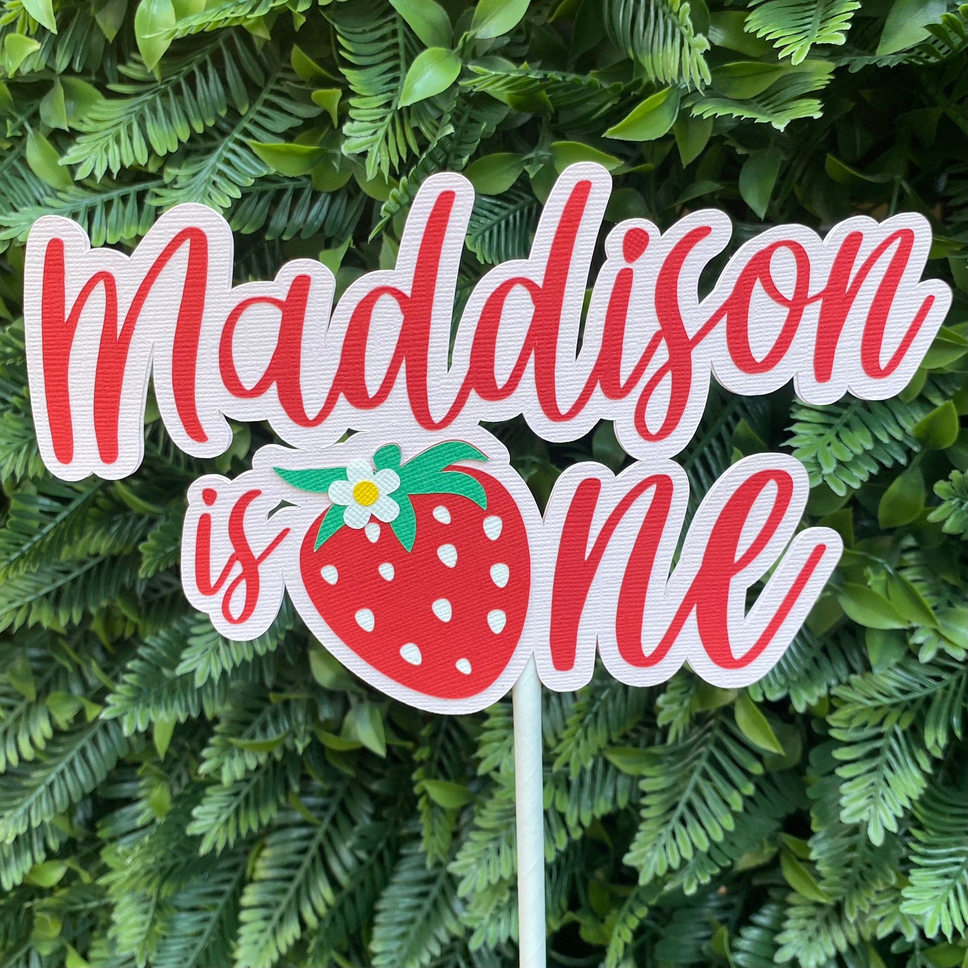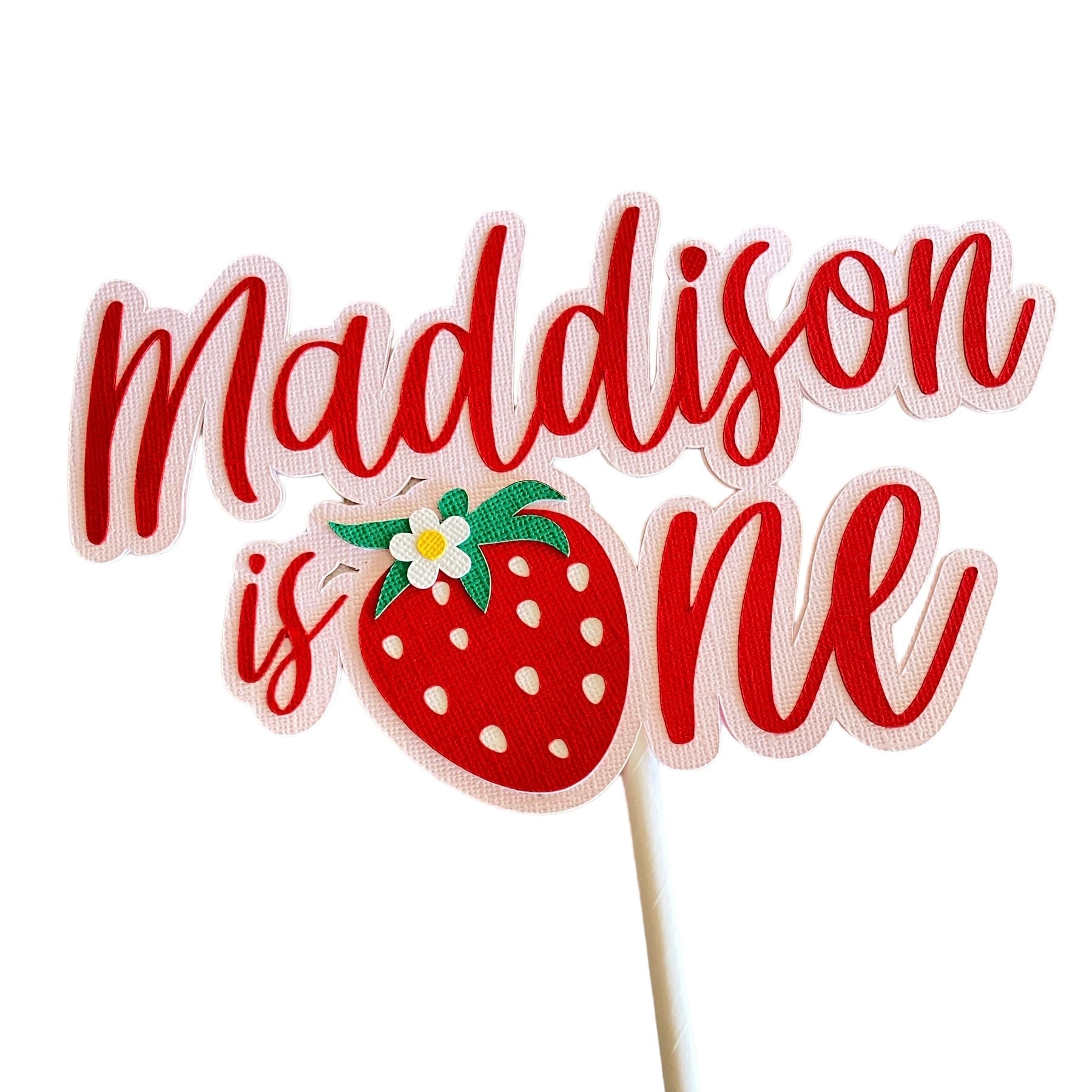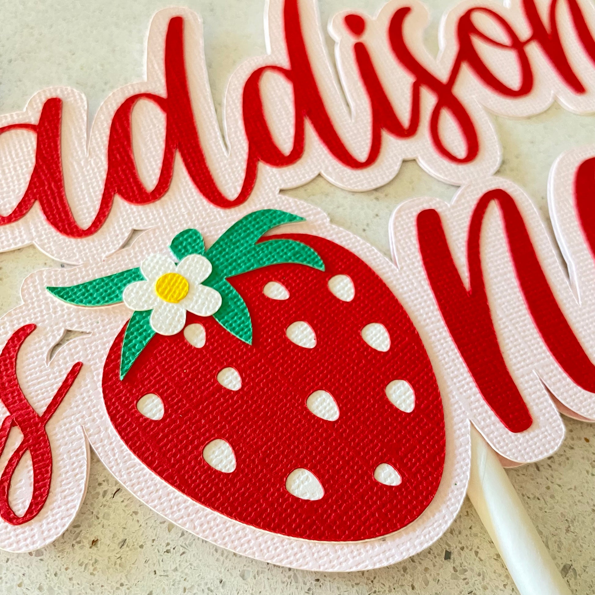 It is made from high-quality pink, red, white and green card stock. This strawberry topper is personalised with a name and number which is hand glued and finished off with a white straw. This is sure to impress and make the cake stand out for that berry first birthday.